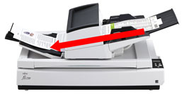 Poprzez zmianę trybu podawania na ręczny/pojedynczy można łatwo skanować dokumenty o większej grubości, takie jak rysunki złożone na pół, wielowarstwowe rachunki i koperty za pomocą tej samej ścieżki papieru.
