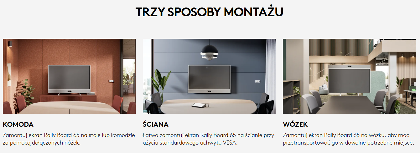 Konfiguracja po wyjęciu z opakowania wymaga zaledwie kilku czynności i minimalizuje konieczność wzywania pracownika działu wsparcia IT. Dzięki dołączonym uchwytom i zdalnej konfiguracji ekran Rally Board 65 można uruchomić w ciągu kilku minut.