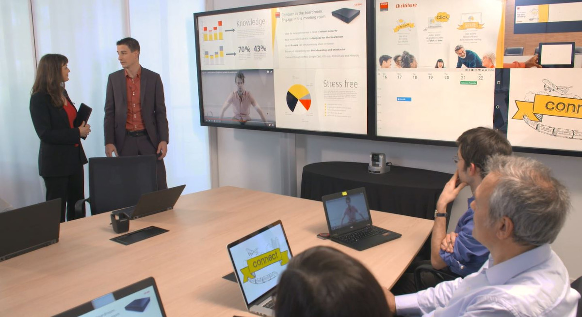 Z ClickShare, można po prostu dzielić się treścią wyświetlaną na komputerze lub urządzeniu przenośnym na ekranie prezentacji.